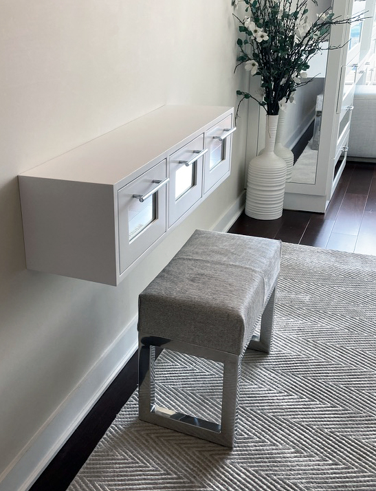 Wall hung makeup vanity with mirror-paneled drawers. Wall mirror to come. A corner of an 8 ft. tall modern custom closet, see details here Showcase your treasures on this electric fireplace surround Pristine white kitchen with many details "Maria and Alan: Feel free to include my kitchen in your list of contacts for new clients. I would be happy to show them the beautiful work you do. I am very happy the way everything turned out." –N. A kitchen peninsula with lots of work space A toekick drawer for extra storage Pullout drawers for easy access Double layered cutlery drawer Bread drawer Spice rack on back of door for easy access Walnut media console and floating shelves. "It's beautiful. We love it" – L. Walnut bookcase to complement the media center above. Two fixed shelves top and bottom with adjustable shelves in the middle. Darker contrasting back and toe kick. "Hi Alan, I’m so excited about the new bookcase, thanks for working with us on the design changes. A few of my neighbors are interested in contacting you about their own projects. I’ll direct them to your website." – L. Gray and white kitchen and island delight "Thanks for an amazing kitchen Alan" – F. "Hi Alan, I can't say it enough, but I love my cabinets!!! I took some pictures you can share with clients." – M. Picture perfect fireplace surround Stereo system wiring hidden behind side panel and running through mantle An impressive 11 foot wall hung vanity An ivory painted frameless kitchen Pantry next to refrigerator with pullout shelves Rustic pine floating shelves PORTFOLIO PAGE 1 • 2 • 3 • 4 • 5 • 6 • 7 • 8 • 9 • 10 • 11 • 12 • 13 • 14