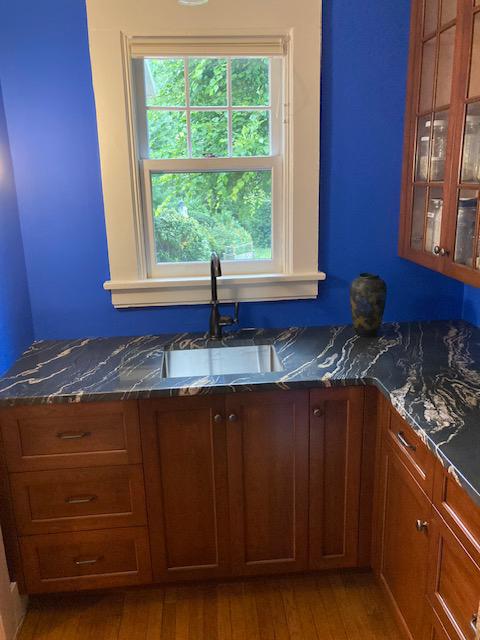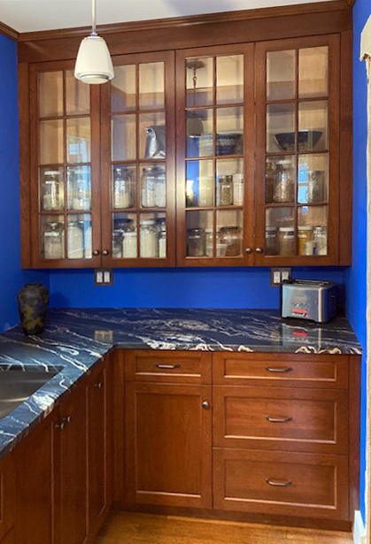 A cherry butler's pantry A unique walnut shelf unit to display your treasures And ta-dah Stained oak media center and builtins left unfinished for a more rustic look Here you can see the unique live edge counter and the Plenty of cubby storage below the seating bench Bookshelves on the side of unit which adds extra display area The bench seating and cubbies continue on the other side White frameless shaker style stunning kitchen - see details here "By the way, I wasn't around for your last visit, but crown moldings are awesome! You were masterful in accommodating the uneven ceiling in the corner. Thanks!"– K. Exquisite master bath... featuring a wall hung vanity ... and a unit with built-in hampers and jewelry drawers "Hi Alan- Just finally getting the time to write a note to say thank you. The new cabinets We’ll talk again soon, K." Before and after - shelves and pullouts to keep pantry organized A set of display cabinets Closet with a wood textured laminate Radiator cover and air conditioner cover Opens for easy access Storage on each side Storage above Dine on a blue island with butcher block top "I've never been so excited to come home - WOW!!!!! J. and I are trying to think of things thank you again so much! It's gorgeous! Painted gray shaker-style vanity Cherry office built-ins with desk area and extra deep cabinets to accomodate video equipment Cabinets wrap around corner in room for more storage space as seen below PORTFOLIO PAGE 1 • 2 • 3 • 4 • 5 • 6 • 7 • 8 • 9 • 10 • 11 • 12 • 13 • 14