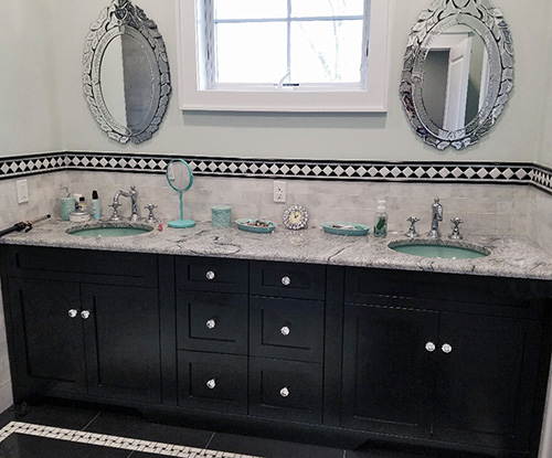 Master bath walnut wall hung vanity with additional cabinets
