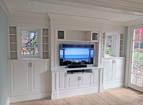This stunning media center done in between and around two windows.