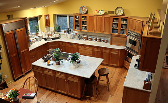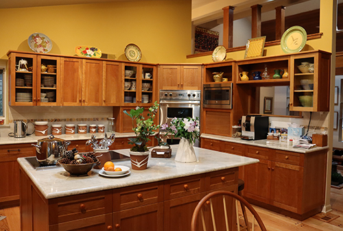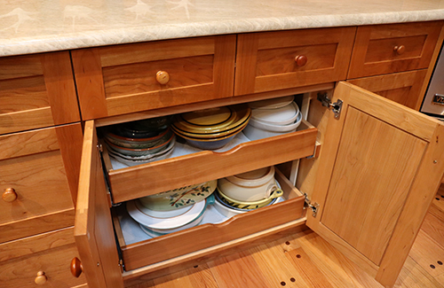 Natural cherry kitchen cabinets with shaker doors and drawers