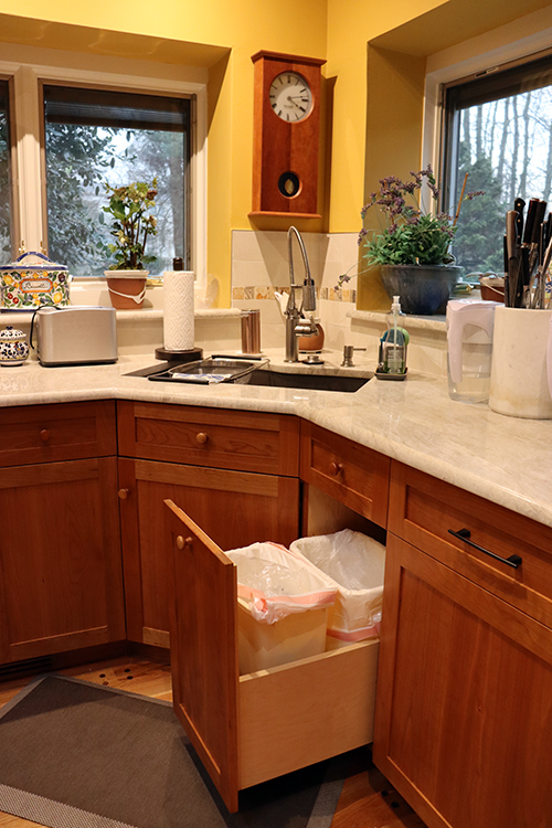 A corner sink, garbage and recycle pullout, and